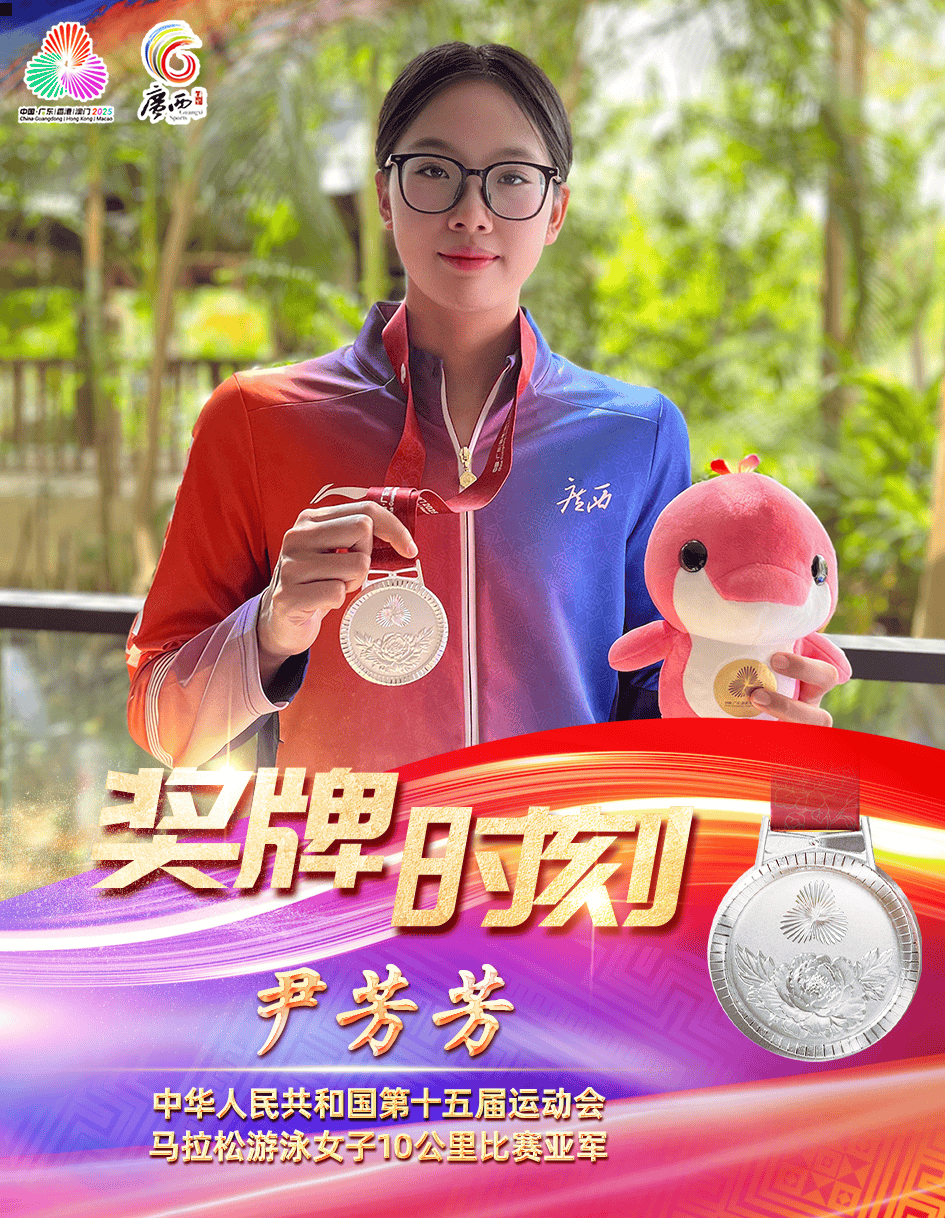 11月5日,第十五届全运会女子10公里马拉松游泳决赛,在深圳大鹏半岛桔钓沙天然海域展开,共有18个代表团的44名选手参与角逐。运动员需要在赛道上绕行6圈,完成10公里挑战。比赛伊始,尹芳芳便先声夺人,处于领游位置。但随着体力消耗,尹芳芳最后一圈时被大部队追上,直至进入终点线前百米,处于第五位置的她咬牙冲刺,最终以2小时12分04秒8完赛,收获银牌。这是广西运动员在全运会上的首枚马拉松游泳项目奖牌。