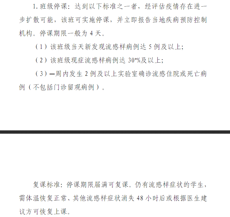 关于复课标准:停课期限届满可复课,仍有流感样症状的学生,需体温恢复正常、其他流感样症状消失48小时后或根据医生建议方可恢复上课。