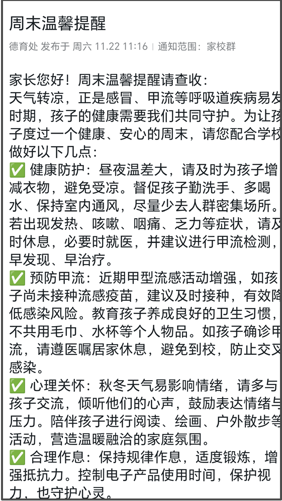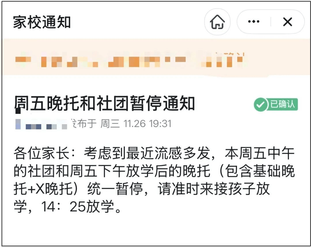 还有同区另一所公办小学的家长,收到了班主任发来的温馨提醒:考虑到最近流感多发,本周五中午的社团和周五下午放学后的晚托统一暂停。