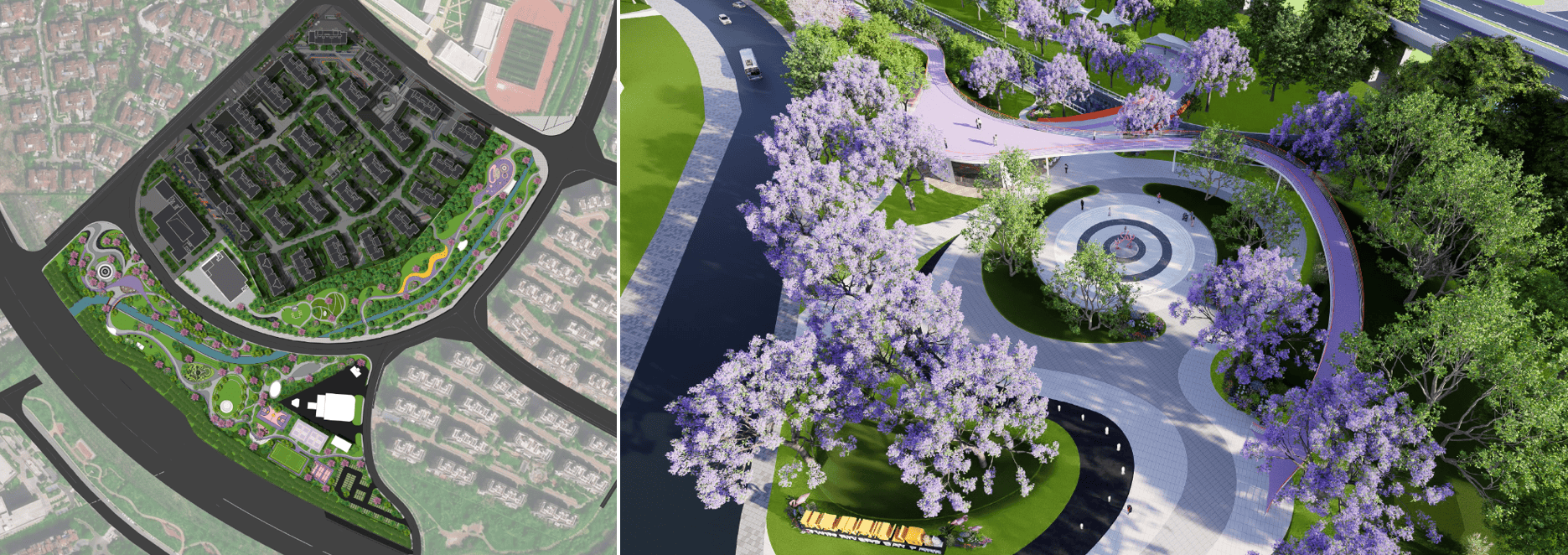 细节设计:商业文化中心采用广场水景+序列铺装+特色LOGO墙,搭配香樟、美丽异木棉,营造“步步进阶”的归家仪式,提升居住尊崇感。