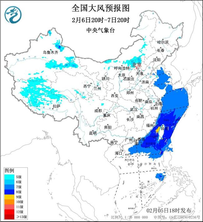 2月6日20时至7日20时,新疆北疆东部、甘肃西部、西藏中北部、内蒙古中东部、辽东半岛、山东半岛等地部分地区有5~6级风,阵风7~8级。黄海大部海域、东海大部海域、台湾海峡、台湾以东洋面、巴士海峡、南海北部海域将有7~8级、阵风9级的大风,其中台湾海峡部分海域风力可达9级、阵风10级。
